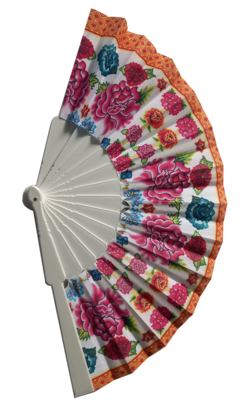 Abanico de tela impresa y varilla de plástico de excelente calidad.