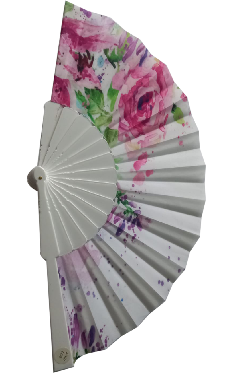 Abanico de tela impresa y varilla de plástico de excelente calidad.