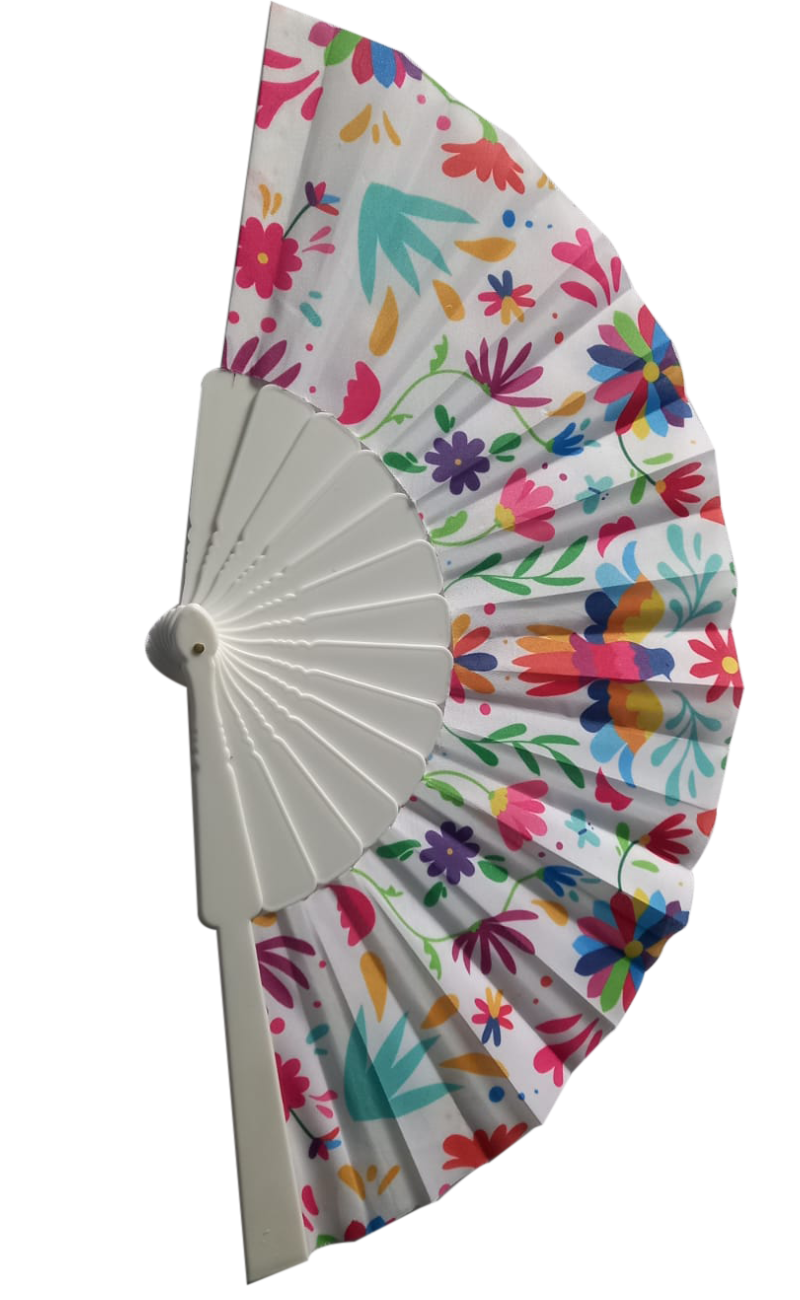 Abanico de tela impresa y varilla de plástico de excelente calidad.