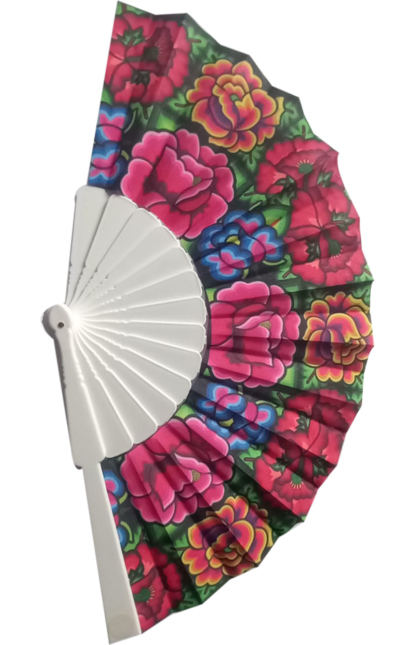 Abanico de tela impresa y varilla de plástico de excelente calidad.