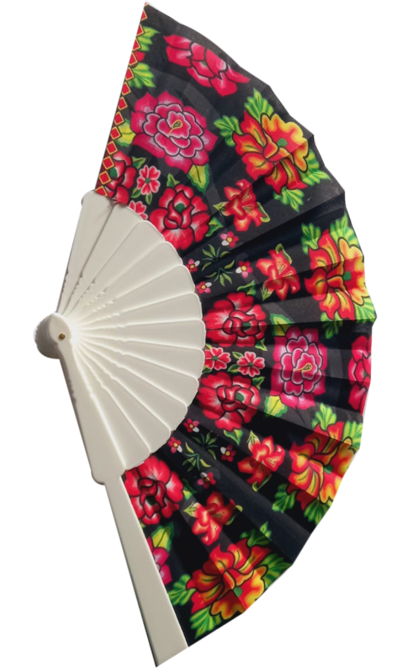 Abanico de tela impresa y varilla de plástico de excelente calidad.