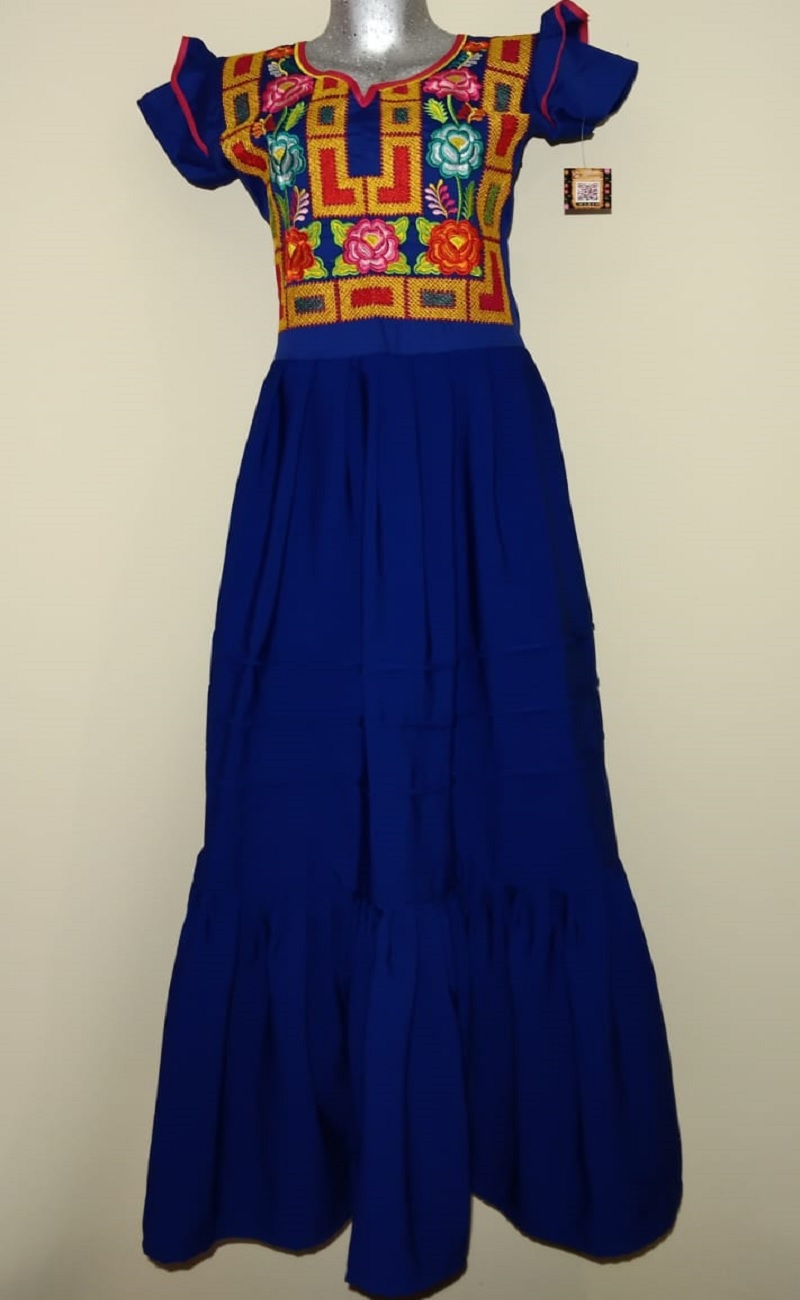 Home Tienda Vestidos tipicos Vestido azul doble manga bordado de flores y cadenilla